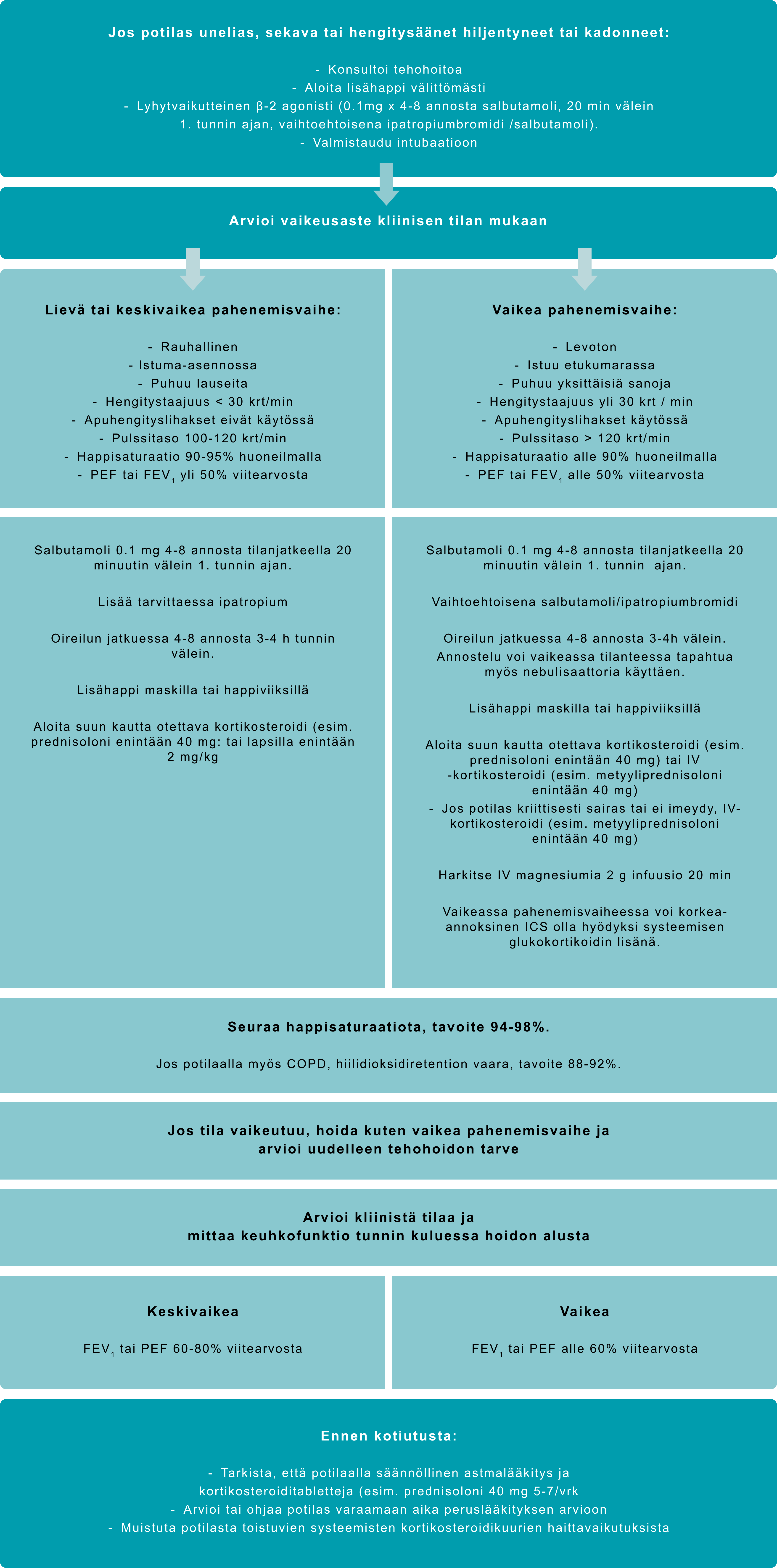 • Jos toistuvia pahenemisvaiheita (kahdesti tai useammin vuodessa), tarkista hoidon toteutuminen ja tarvittaessa lähetä erikoissairaanhoidon arvioon, kts vaikea astma.