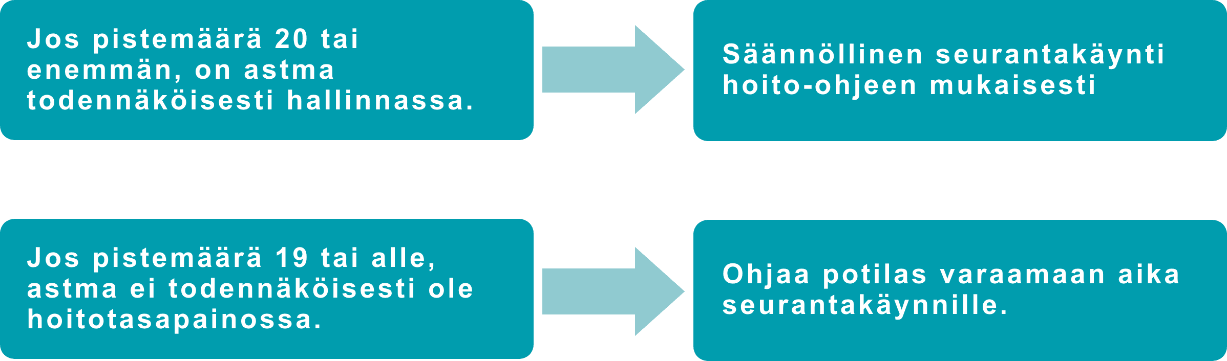 | Päiväaikaiset oireet | ≤ 2 krt vkossa, mieluiten ei lainkaan. | Hyvän hallinnan taso saavuttamatta yhdessäkin kohdassa | Hyvän hallinnan taso saavuttamatta kolmessa tai useammassa kohdassa |